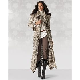 Sweater-coat in tweedy acrylic yarn with textural tuck stitching, open weave pattern. Funnel neck, button front, tie belt. Hand wash. Imported. Ankle-length sweater-coat Looks good on the model. Ugly in real life. Too floppy, had no form whatsoever. Front was longer than the back. Very disappointing. Returned it immediately and took a monetary loss on the refund.